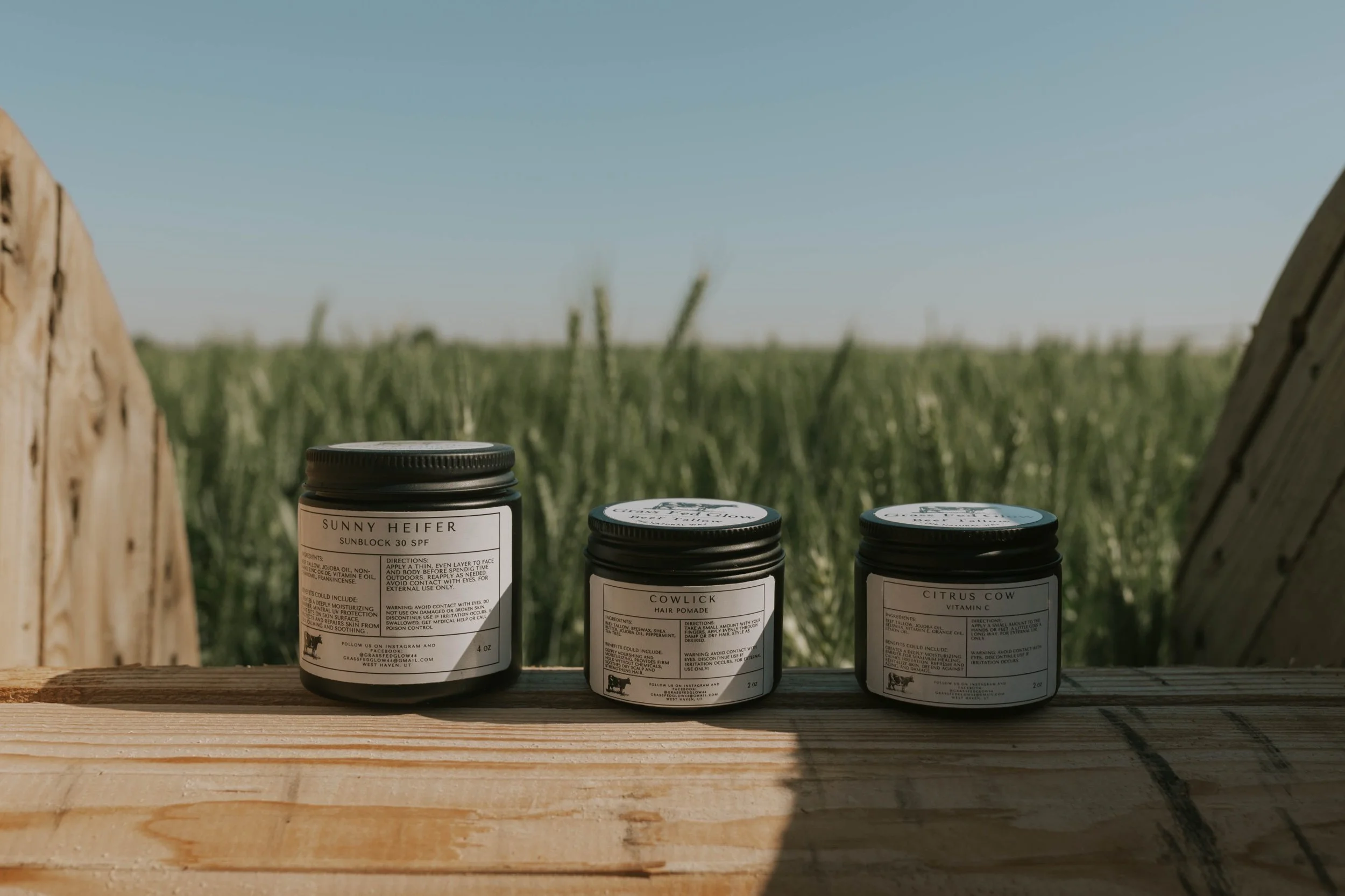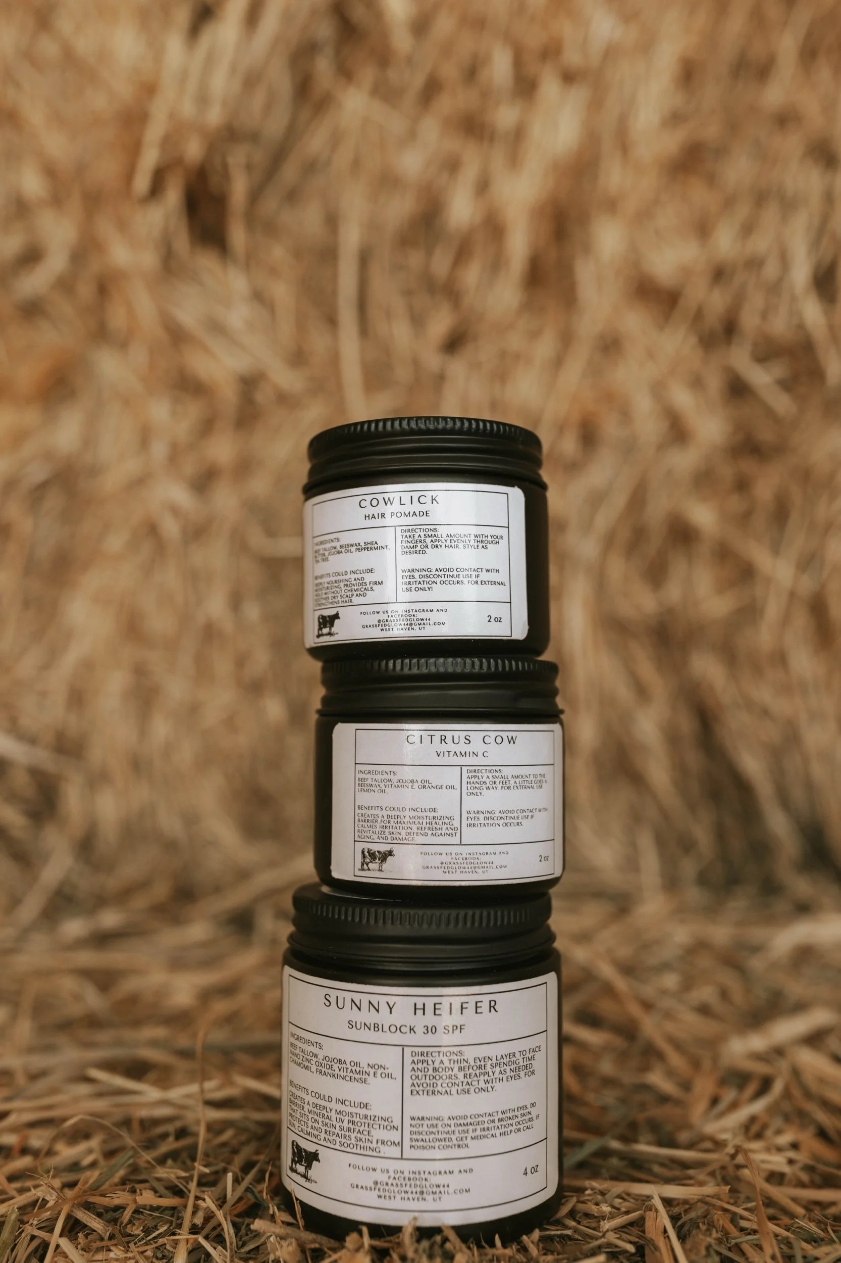 Udderly Ageless from $25.00 Moo-Ther’s Touch from $20.00 Amber Hide $13.00 Island Hide $13.00 Sold out Sunny Heifer from $20.00 No Bull Breakout from $20.00 Heavenly Hooves from $20.00 Udder Relief from $20.00 Citrus Cow from $20.00 Cowlick from $20.00 Bovine Beauty from $20.00 Moolixer $13.00 Gift Card from $25.00 Small batchesOur tallow is handmade in small batches, to ensure a quality product you will love. Contact me